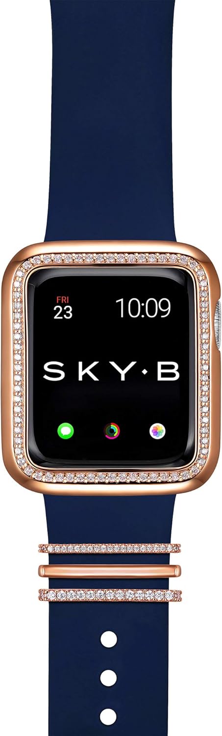 Give your smart watch the gorgeous look of diamond-accented jewelry with unique smart watch cases by SKYB! This stunning frame is compatible with the Apple Watch; it comes in four sizes, tested to perfectly fit the 38 millimeter and 42 millimeter from Apple Watches from Series 1, Series 2 and Series 3, or the 40mm and 44mm Apple Watches from Series 4 and Series 5. Our exclusive design boasts cubic zirconia stones in a unique and breathtaking emerald-shaped cut-corner design encircling the shell. CZ is an affordable option that gives the look of colorless diamonds to match your other diamond jewelry. We selected only the highest quality available for these cubic zirconia gemstones, making this design absolutely dazzling. Our cases snap onto your Apple iWatch simply and easily. A silicon liner feature ensures the watch guard attaches securely and with perfect alignment. The slender profile provides an outside layer so you can wear your watch every day in style. The styling of our smart watch frame is streamlined and elegant; the edges aren’t sharp; they are buffed at the corners so they won’t scratch your skin.All our SKYB Apple smartwatch rims are made with a foundation of bronze metal for strength, plated with fine silver for durability, with a final plated finish in genuine precious metal that gives the luxe look of fine jewelry: - Silver-tone white rhodium - 18K yellow gold - 14K rose gold Buy one in every style and color to express your personality and to match your outfits and other jewelry! We know you’ll be absolutely won over by the superior craftsmanship and styling of this piece. With our 100% Money Back, No-Questions-Asked Customer Delight Guarantee good 30 days after purchase, and all our SKYB cases warranted against manufacture defects for one full year, you can be confident buying this superior designer-style case for authentic Apple brand smart watches today.