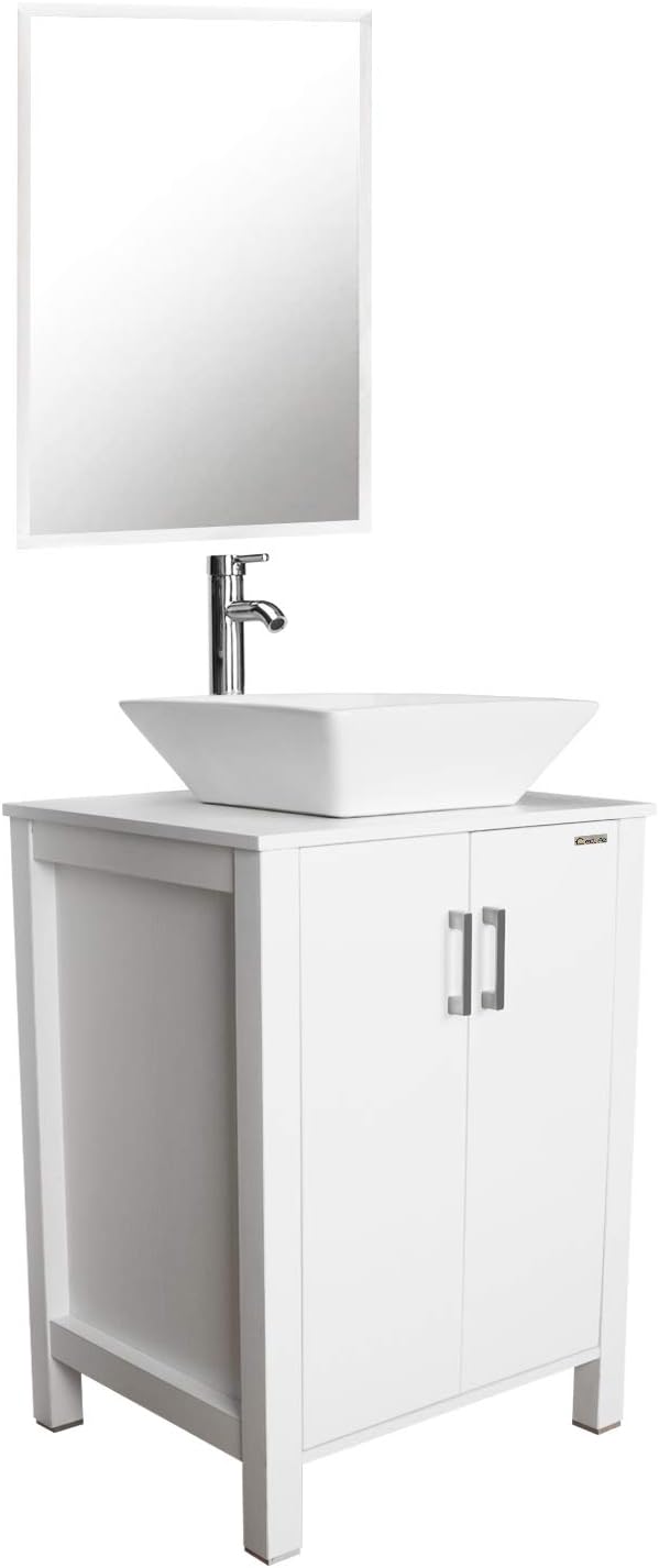 eclife 24” Bathroom Vanity Sink Combo White Cabinet Vanity Vessel Sink & 1.5 GPM Water Save Faucet & Solid Brass Pop Up Drain, with Mirror (A07B04W)